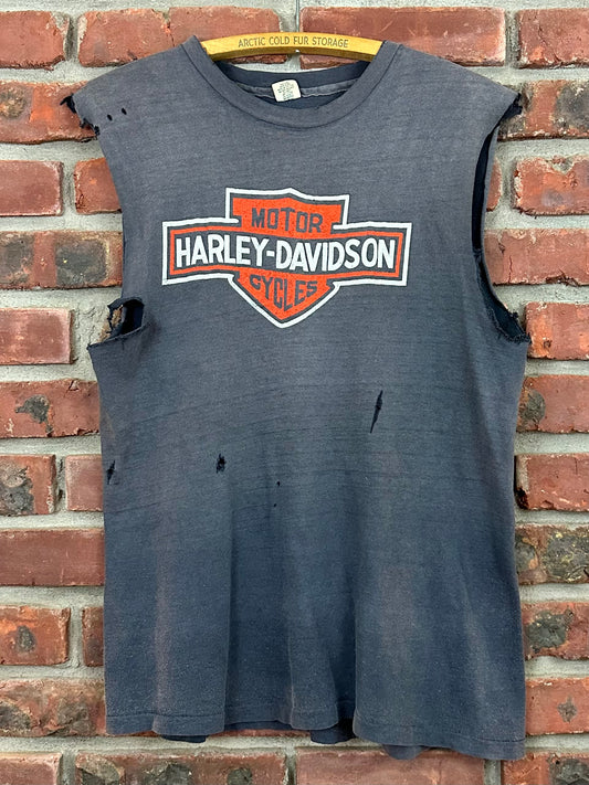 Vintage 70s 1970s HARLEY DAVIDSON Motorcycles Bar and Shield Sleeveless Cut-Off T-Shirt Biker Tank Top Alabama Dealer Distressed Black Hanes Label Mens Medium M 18.5x26.25