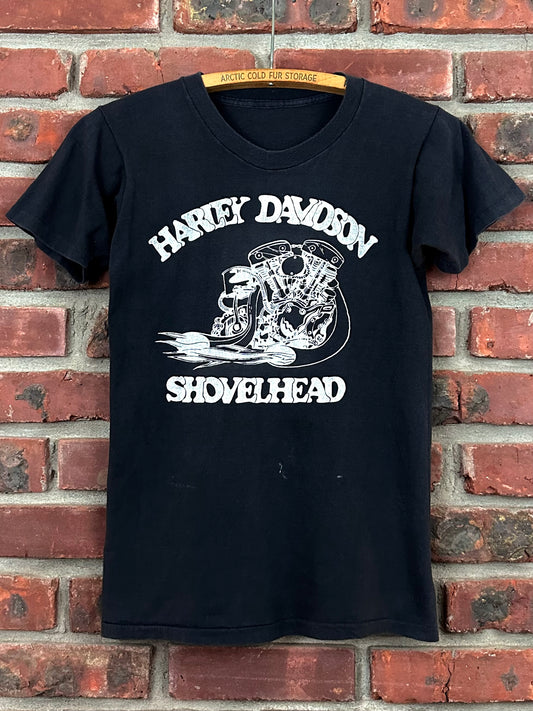 Vintage 70s 1970s HARLEY DAVIDSON Motorcycles Shovelhead Biker T-Shirt Motor Engine Faded Black Mens Extra Small XS