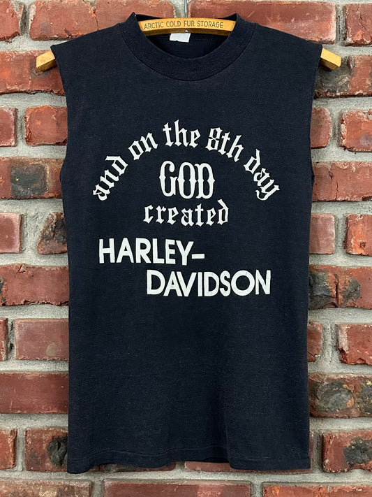 Vintage 70s 1970s HARLEY DAVIDSON Biker Sleeveless T-Shirt Tank Top Motorcycles 8th Day God Created Sports Unlimited Sterling Colorado Dealer Velva Sheen Label Mens Extra Small XS 15x24.75