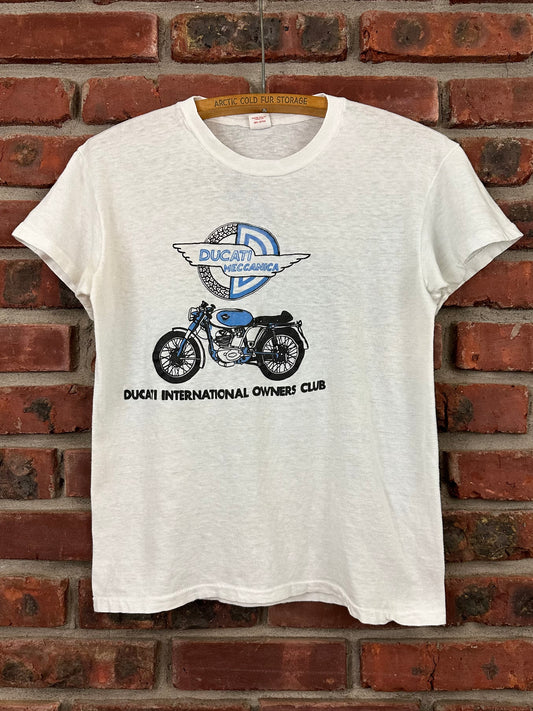 Vintage 70s 1970s DUCATI MECCANICA Motorcycles International Owners Club T-Shirt Desmo Biker Soft White Hanes Label Mens Extra Small XS 16.5x22.5