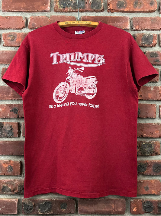 Vintage 80s 1980s TRIUMPH Motorcycles Dealer T-Shirt Franks Motorcycle Sales & Service Essex Vermont Soft Burgundy Red Hanes Label Mens Medium Large M L 20x27.25