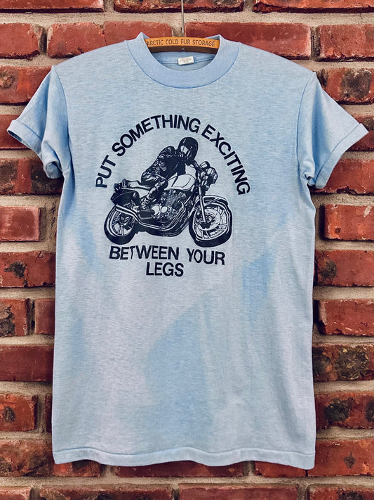 Vintage 80s 1980s YAMAHA TRIUMPH KAWASAKI Reliable Cycle Inc Minneapolis Dealer T SHIRT Put Something Exciting Between Your Legs Devknit Mens Small S 17.25x26.25