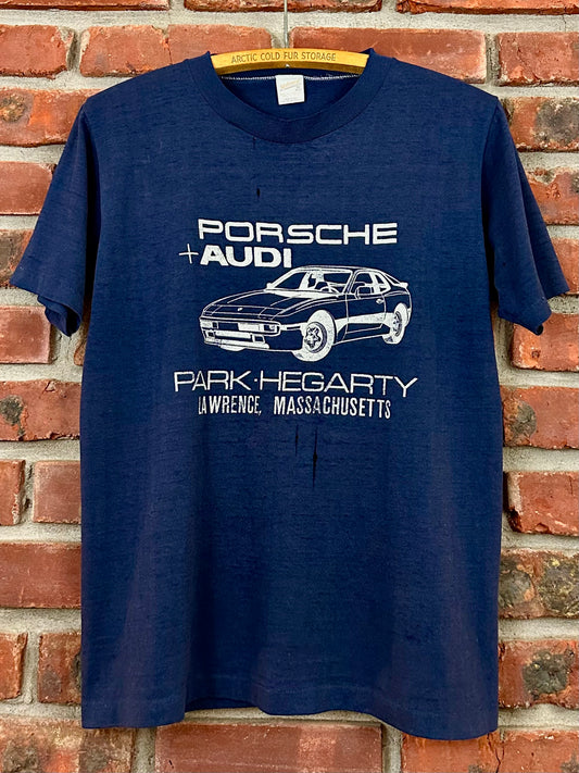 Vintage 80s 1980s PORSCHE AUDI Dealer T-Shirt 944 Coupe “Nothing Even Comes Close” Blue Sportswear Label Mens Small S