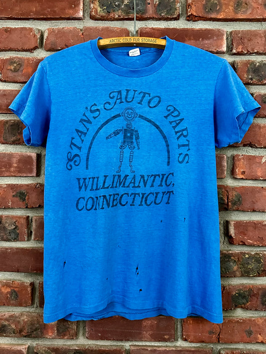 Vintage 60s 70s 1960s 1970s STANS AUTO PARTS Willimantic Connecticut T-Shirt Car Repair Mechanic Blue Hanes Mens Small S