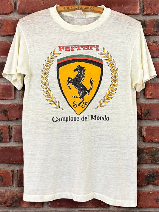 Vintage 80s 1980s FERRARI Campione Del Mondo F1 World Champion T-Shirt Formula One Auto Racing Paper Thin Burnout Pale Yellow Hanes Mens Small S 17.25x25