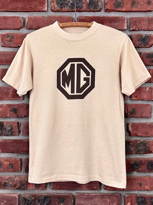 Vintage 80s 1980s MG Morris Garages Logo T-Shirt British Car Automotive Auto Mechanic Light Beige Hanes Mens Small S 17.25"W 25.75”L