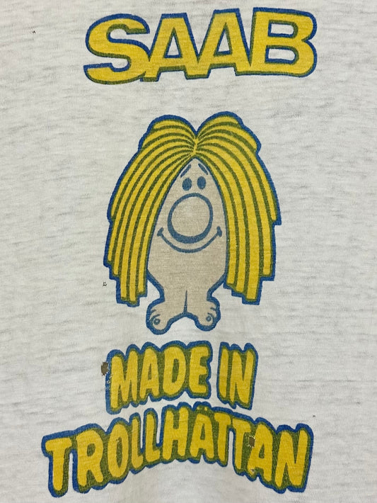Vintage 70s 1970s SAAB Made In Trollhattan Sweden T-Shirt Swedish Car European Automotive Auto Paper Thin White Mens Medium M