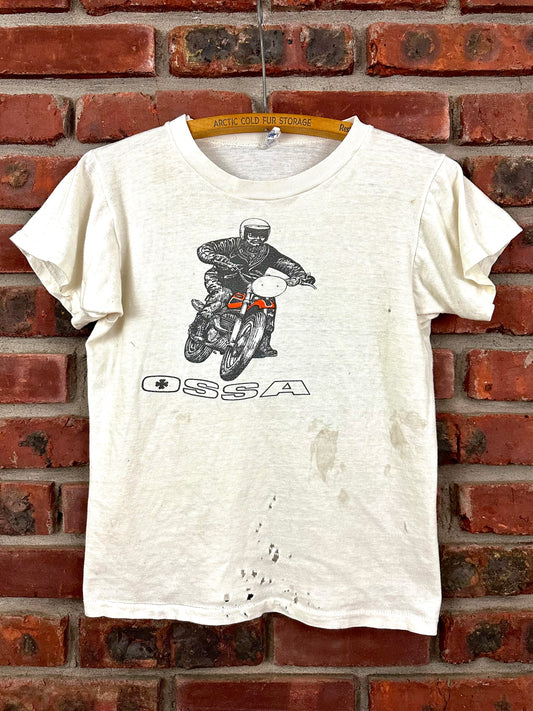Vintage 70s 1970s OSSA Motorcycles Dealer T-Shirt Four Seasons Cycle Center Inc Birmingham Alabama Husqvarna Penton Hodaka White Sportswear Label Mens Extra Small XS 17.25x21