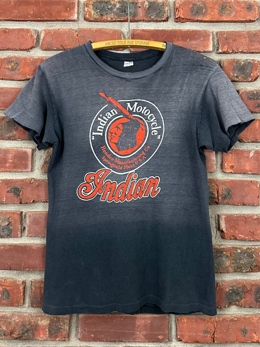 Vintage 70s 1970s INDIAN Motorcycles Dealer Biker T-Shirt Classic Motorcycles of Santa Cruz Dealer Paper Thin Faded Black Hanes Mens Extra Small XS 17.25x24