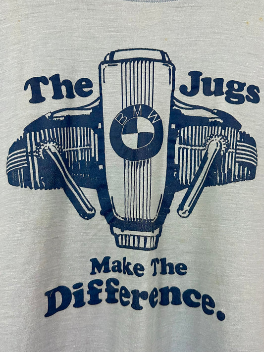 Vintage 70s 1970s BMW Motorcycles Dealer T-Shirt “The Jugs Make The Difference” Four Seasons Medina Ohio Blue Mens S 18.5X24.75