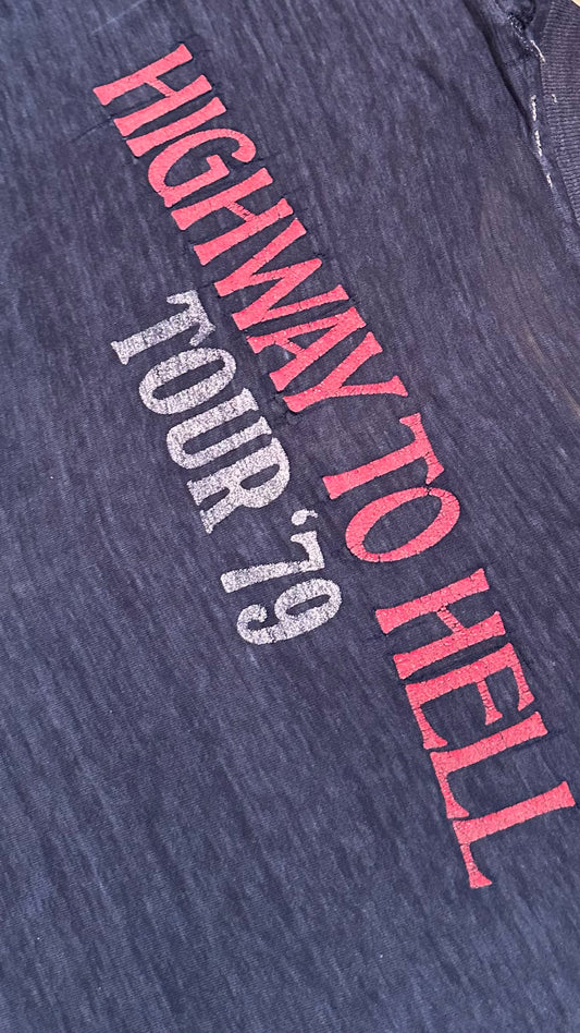 Vintage 70s 1970s 1979 ACDC Highway To Hell Rock Concert Tour T-Shirt Thrashed Distressed Paper Thin Burnout Faded Navy Blue Mens Small S