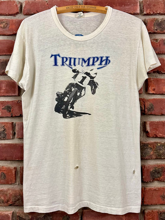 Vintage 70s 1970s Triumph Motorcycles Dealer T-Shirt Wilsons Fresno White Mayo Spruce Label Mens Medium M 19.25x25.5