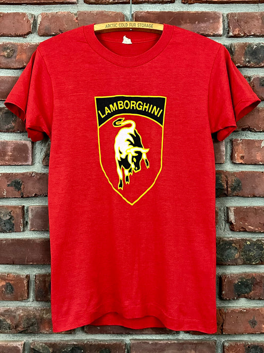 Vintage 80s 1980s LAMBORGHINI T-Shirt Italian European Car Company Auto Automotive Mens Red Screen Stars Label Mens Extra Small XS