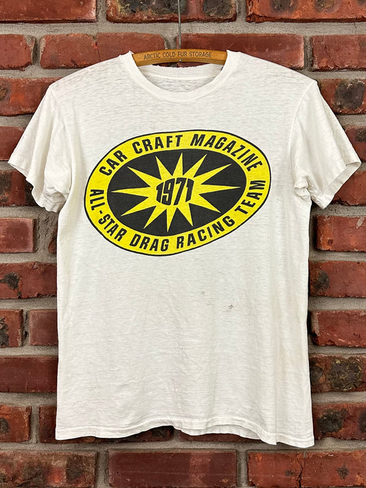 Vintage 70s 1970s 1971 CAR CRAFT Magazine All-Star Drag Racing Team T-Shirt Hot Rod Auto Automotive Speed Shop Distressed Paper Thin White Mens Small S 18.5x24
