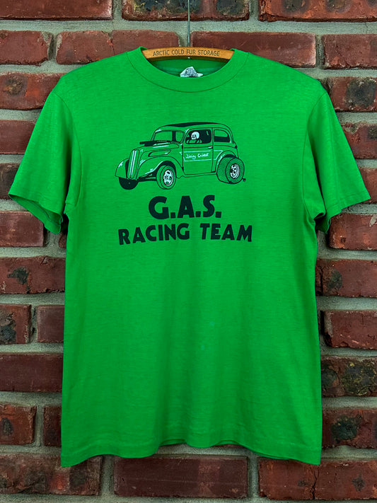 Vintage 70s 1970s JIMINY CRICKET G.A.S. Drag Racing Team T-Shirt Gasser Hot Rod Automotive Auto Green Hanes Mens Small S