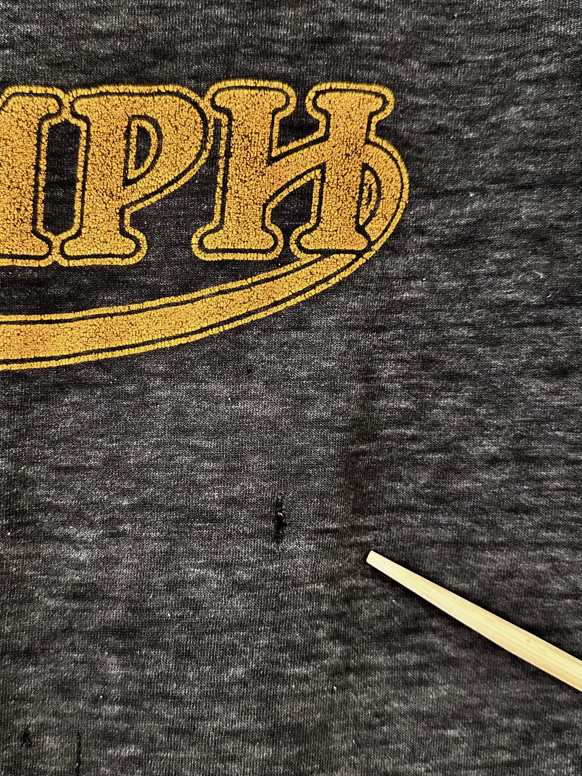 This t-shirt is in awesome, very clean, aged to perfection, vintage condition with awesome signs of aging and wear throughout. This tee is super clean throughout, with no discolorations or stains - just awesome, natural aging. The black color of the shirt has aged and faded to the awesome "heather" charcoal color we see here today. The fabric has aged beautifully over the years and has become extremely soft, thin and comfortable - this is an absolute joy to wear. The fabric has become a bit sheer, but not totally see-through. There are a few small holes here and there which add to the shirts vintage character. The graphic exhibits awesome aging, fading and has softened up to be as soft as the fabric itself. This is definitely one of the most perfectly aged vintage tees we have in stock and is a shop favorite. This has all the hallmarks of the the ideal biker tee.