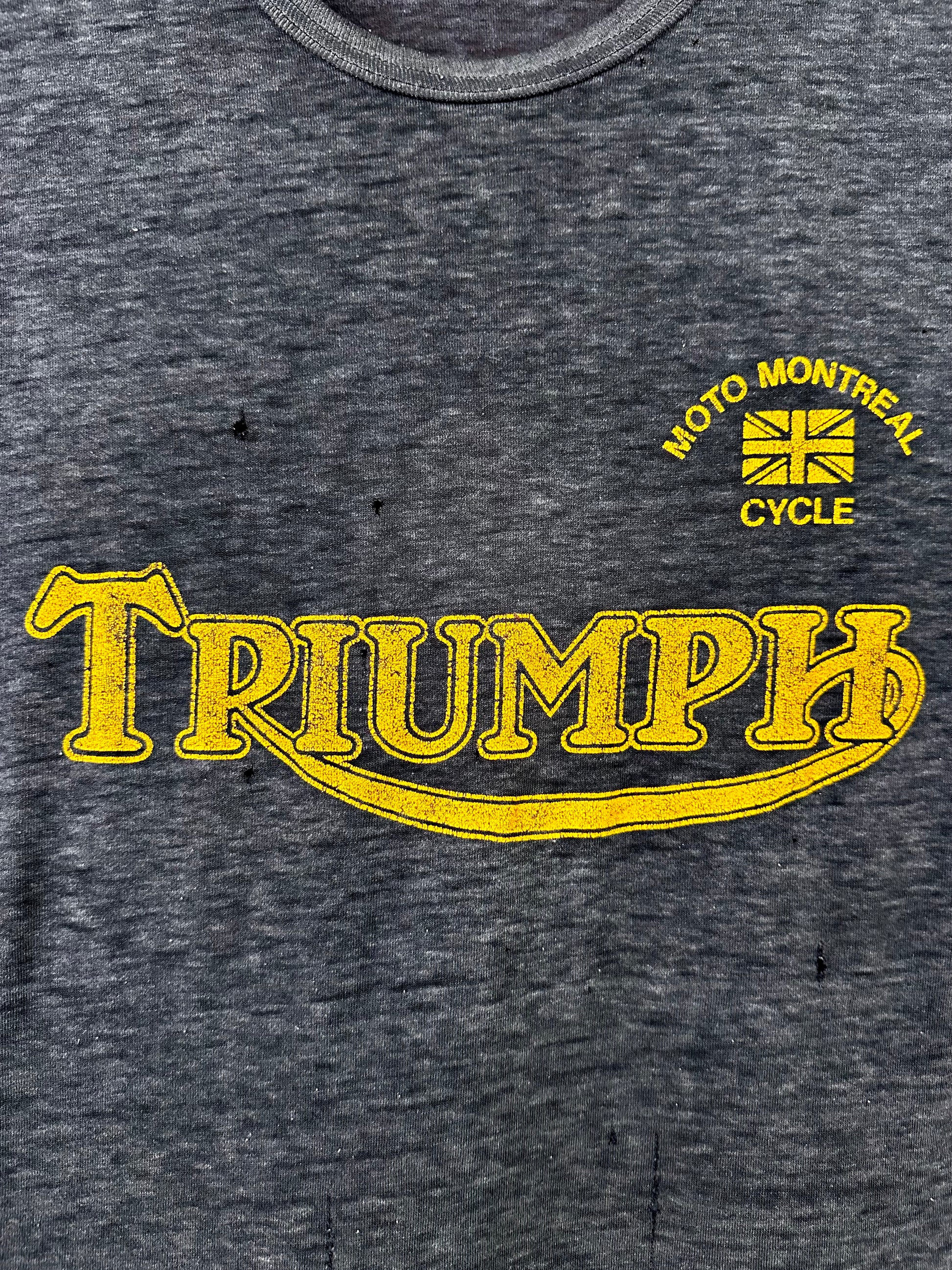 Vintage 70s 1970s TRIUMPH Motorcycles Dealer T-Shirt Moto Montreal Canada Paper Thin Burnout Soft Faded Black Mens Small S 17.25x28.25