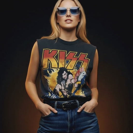 Vintage 80s 1980s 1984 KISS ROCKS TEXAS Animalize Rock Concert Tour T SHIRT Sleeveless Cut-Off Thrashed Distressed Paper Thin Faded Black Mens Medium M *****