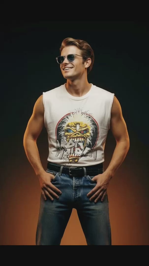 Vintage 80s 1980s 1988 IRON MAIDEN Seventh Son Of A Seventh Son Heavy Metal Rock Concert Tour Sleeveless T-Shirt Cut-Off Tank Top Thin Soft Faded White America Project Label Mens Medium M 19.25x27